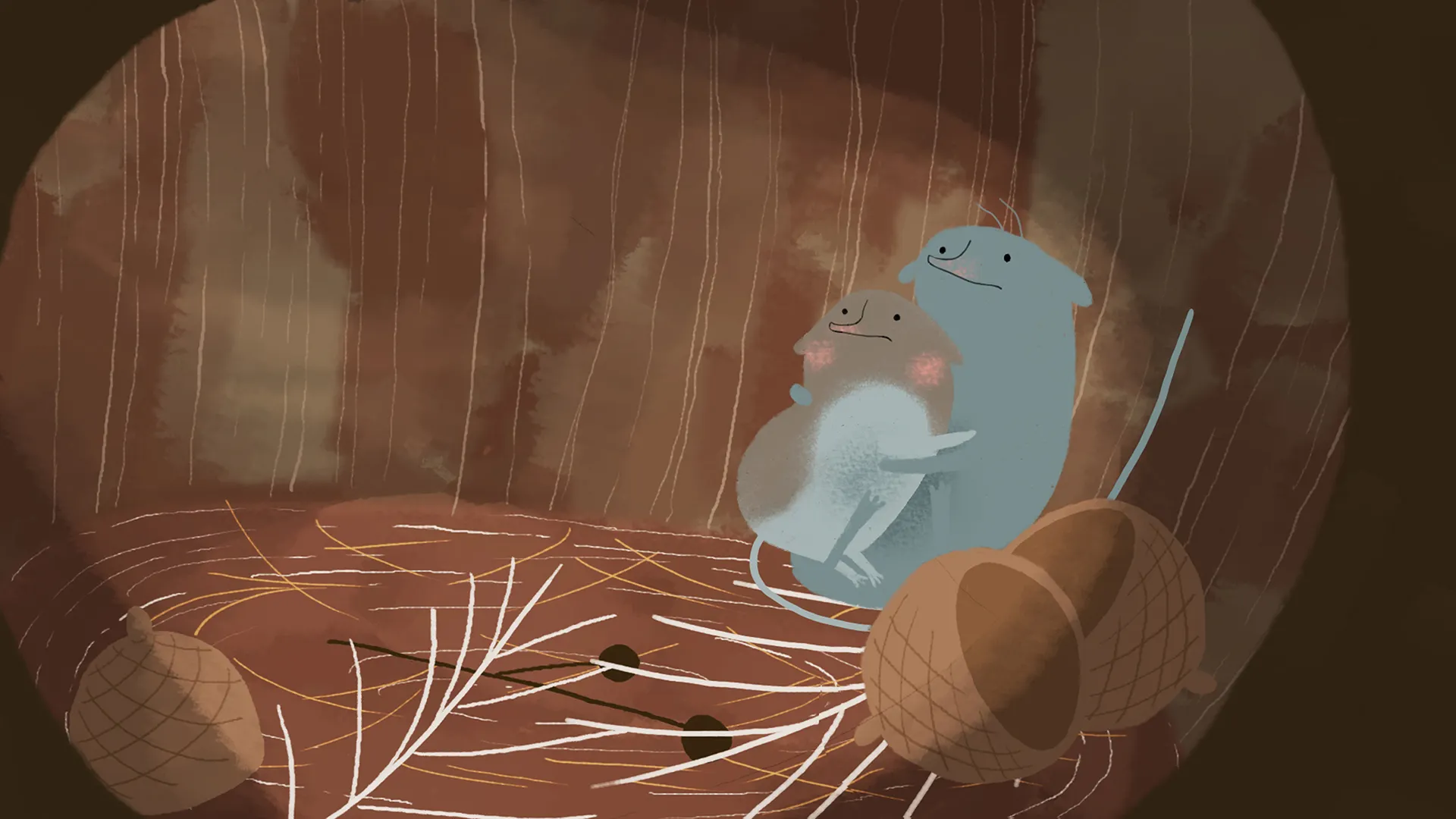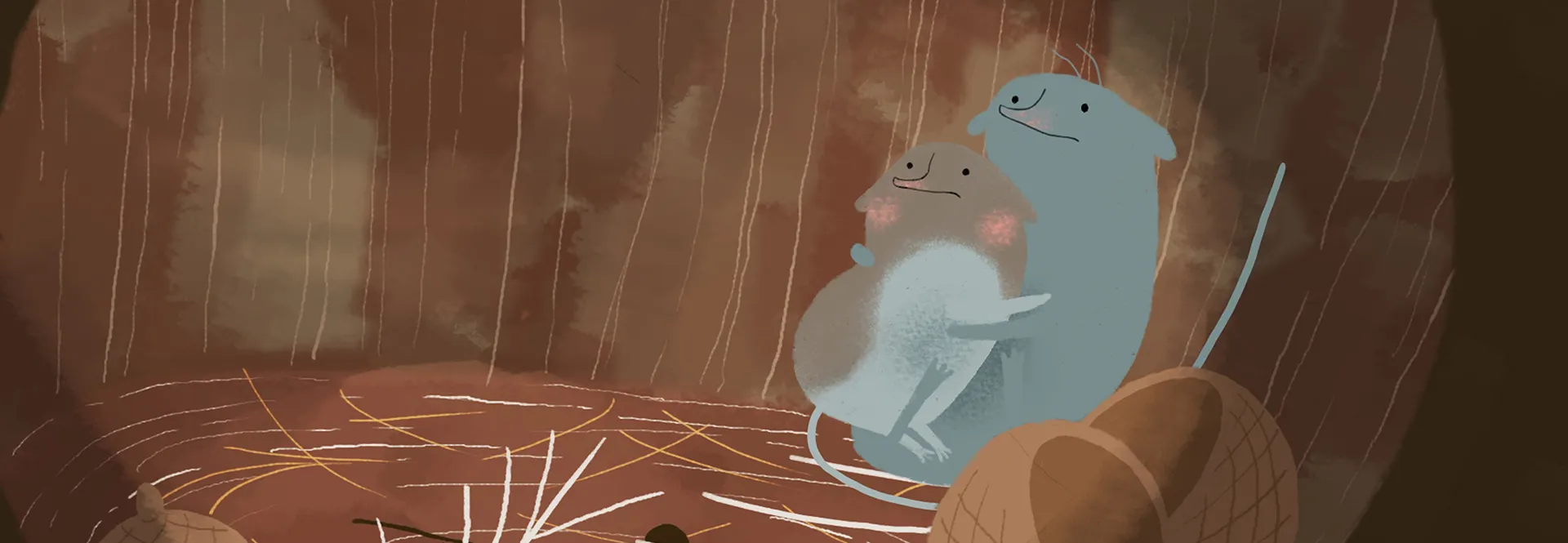 Une petite famille de musaraignes vit au bord d'un ruisseau. Mais un jour, de fortes pluies balaient le village. Par chance, la famille échappe au pire, mais leur maison est détruite.