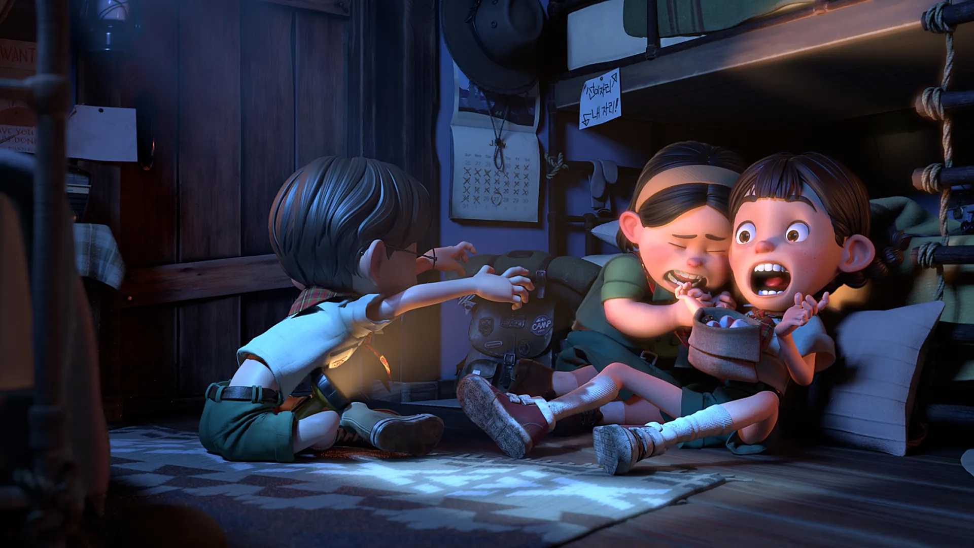 In a cabin at a campsite deep in the forest, three girl scout children sit together and talk about scary stories, and encounter a small strange monster that comes into the cabin.